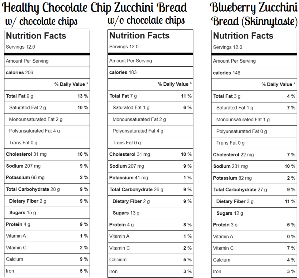 So now, the recipes. The first is a Healthy Chocolate Chip Zucchini Bread. I think it’s perfectly sweetened as-is, with or without the chocolate chips. I have made it with unsweetened applesauce instead of the oil, but in this case the oil version (as-is) is much better and it’s still fairly low-fat and calories. Personally, I prefer this bread refrigerated. I generally don’t like quick breads with chocolate chips, but this recipe is the exception – it is very delicious whether or not you choose to include them! The second recipe is a Blueberry Zucchini Bread from Skinnytaste, and is also delightful as-is.
